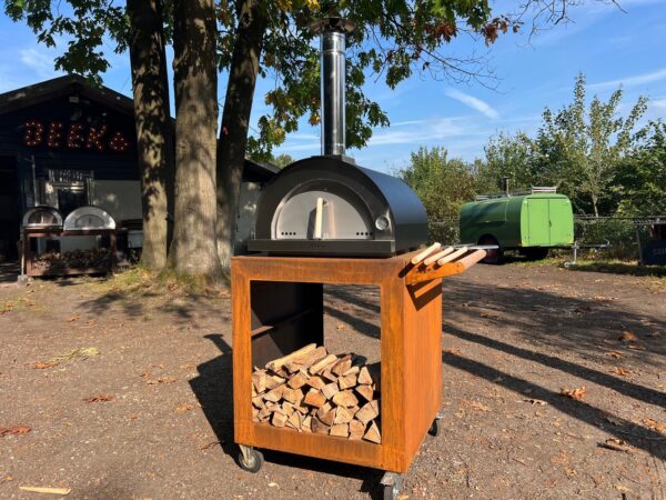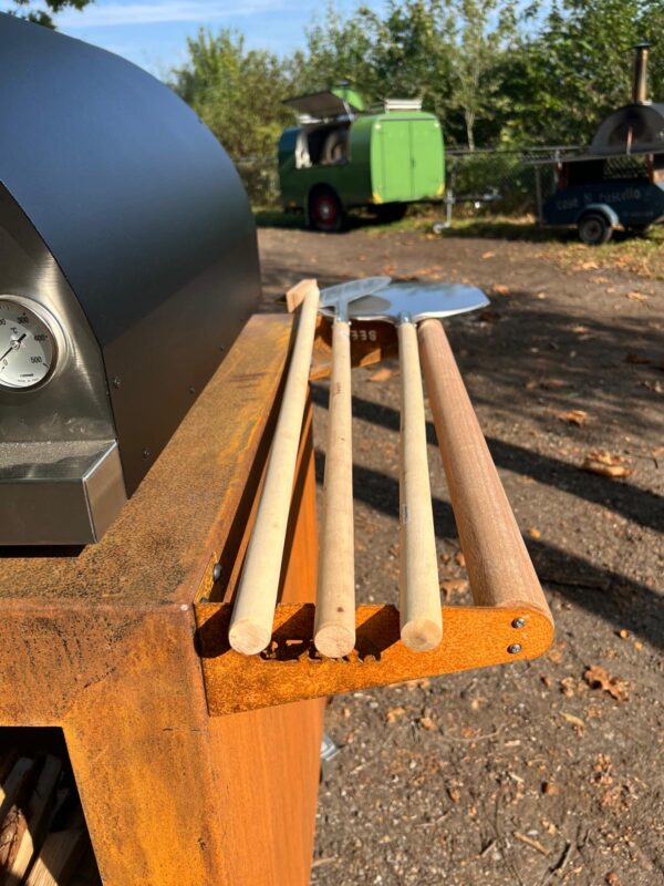Dit model is uitgerust met een onderstel van Cortenstaal dat 100 cm lang is inclusief scheppenhouder en 80 cm breed is, en wordt geleverd met een 3-delige set pizzagereedschappen,f een grote pizzaschep, een werk-/draaischep en een ovenborstel, die allen bijdragen aan een optimale gebruikerservaring. Het speciale pizzatool houder op het onderstel zorgt voor georganiseerd en gemakkelijk bereikbaar gereedschap tijdens het bakken en koken.