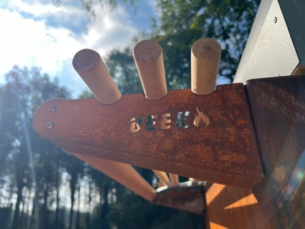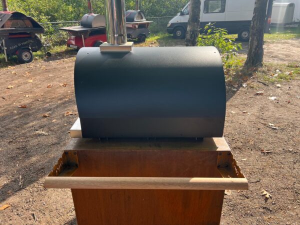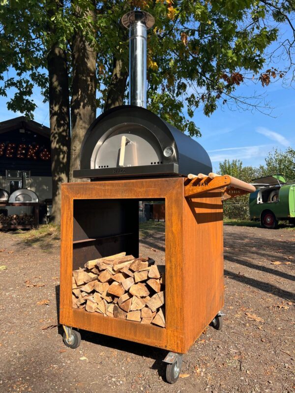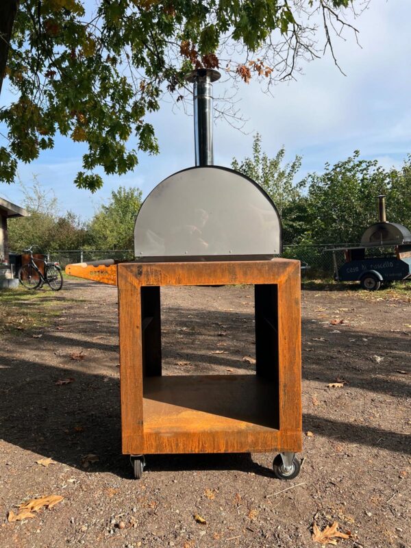 Naast de praktische kenmerken benadrukt het materiaalgebruik de duurzaamheid en esthetiek van de oven. Cortenstaal is bekend om zijn kracht, slijtvastheid en weervaste kwaliteiten, wat resulteert in een product dat zowel functioneel als visueel aantrekkelijk is. De natuurlijke roestkleur van het Cortenstaal geeft de oven een warme en tijdloze uitstraling, perfect passend in elke buitenomgeving.